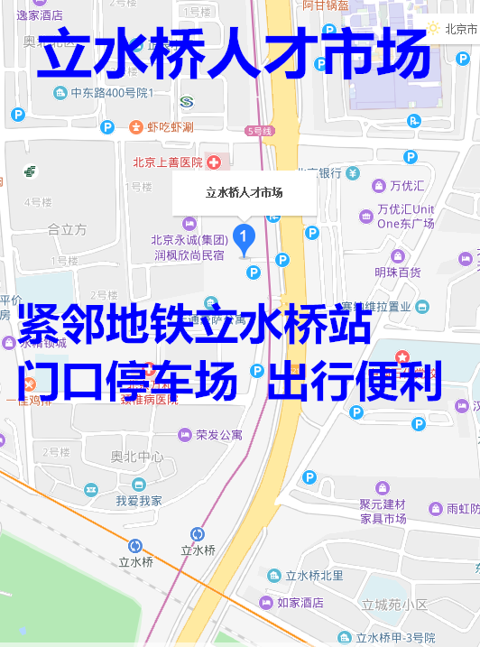 ? ? ? ?立水橋人才招聘會位于北京市朝陽區、海淀區、昌平區三區交界處,交通便利,緊鄰地鐵5號線13號線立水橋站,5號線為北京市軌道交通路網中首條貫穿城市中心、連接南北地區的快速軌道交通干線,方便北京南城北城企業及求職者招聘求職;13號線線路起點西直門,向北經高校云集學院路、清華園、五道口至企業云集的上地、西二旗、北苑、望京,然后途徑全亞洲最大居住社區北京回天地區(回龍觀及天通苑)后至東直門,方便企業招聘及各大高校學生、居民求職。立水橋人才市場立足北京,服務全國,為經濟建設和社會發展提供人力資源保障。